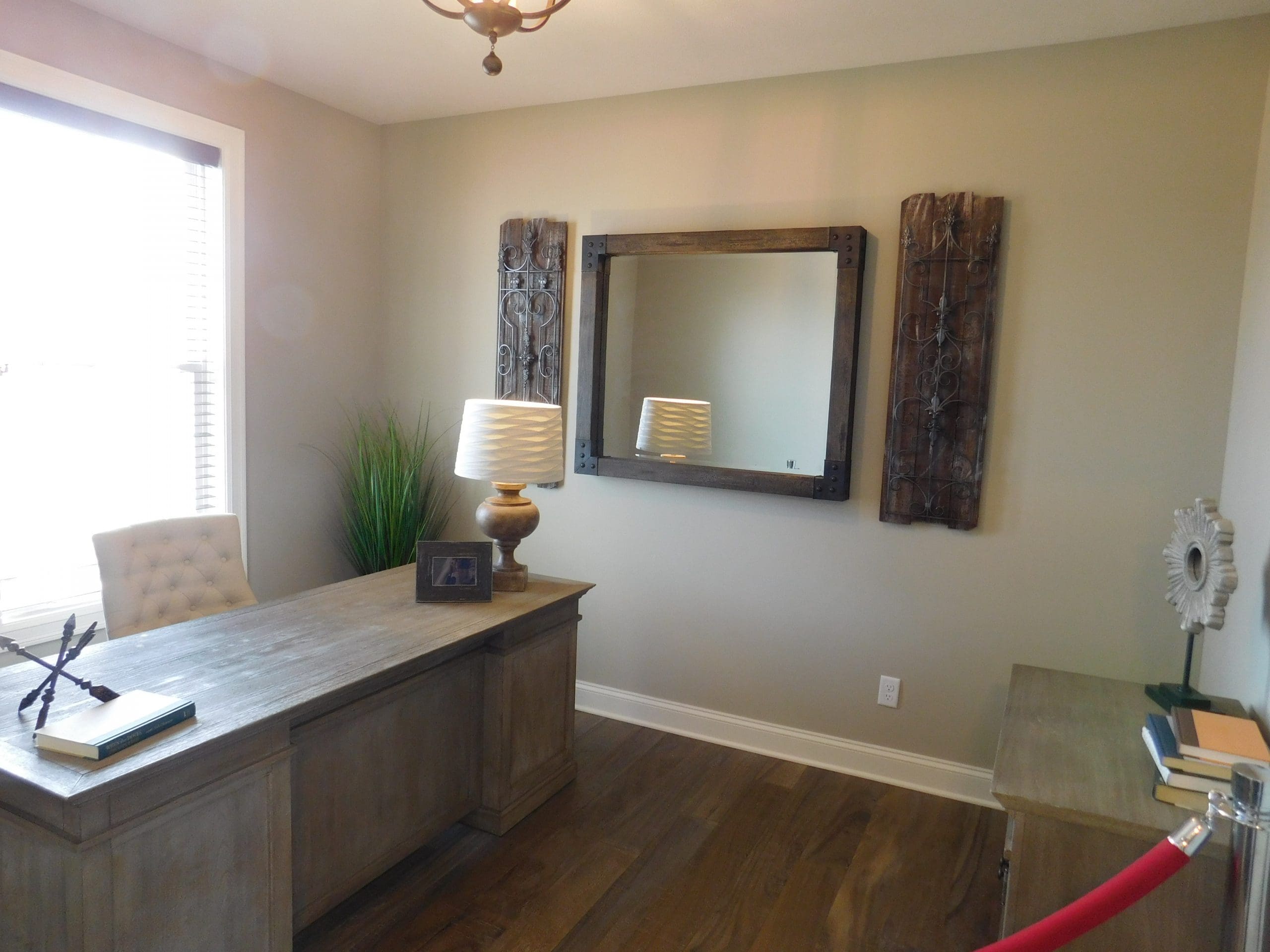 Part of the sparkle in this home comes in the first peek from the foyer through French doors. Bright white panels and crown molding contrast with deep color in this “get-away” tucked by the door. Opposite the room leans an oversized mirror, adding beauty to the entry (and a convenient last look to make sure everything’s in place).