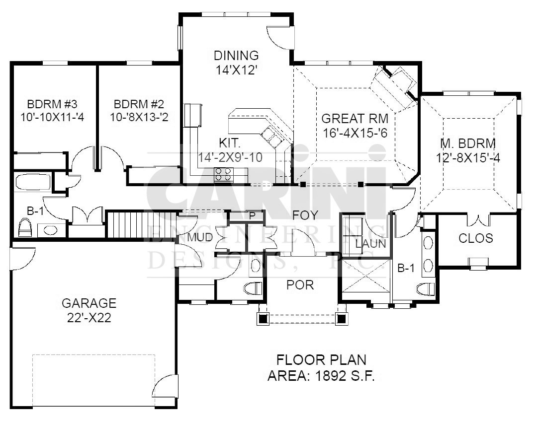 This plan shows single floor living at its best. A split bedroom scheme and buffer space in front provide privacy in living areas. Gabled entrance and garage add exterior style. Tray ceilings and a corner fireplace add interior flourishes.  Design Series plan #2531 copyright owned by Carini Engineering Designs.  Artist’s rendering for preliminary use only.